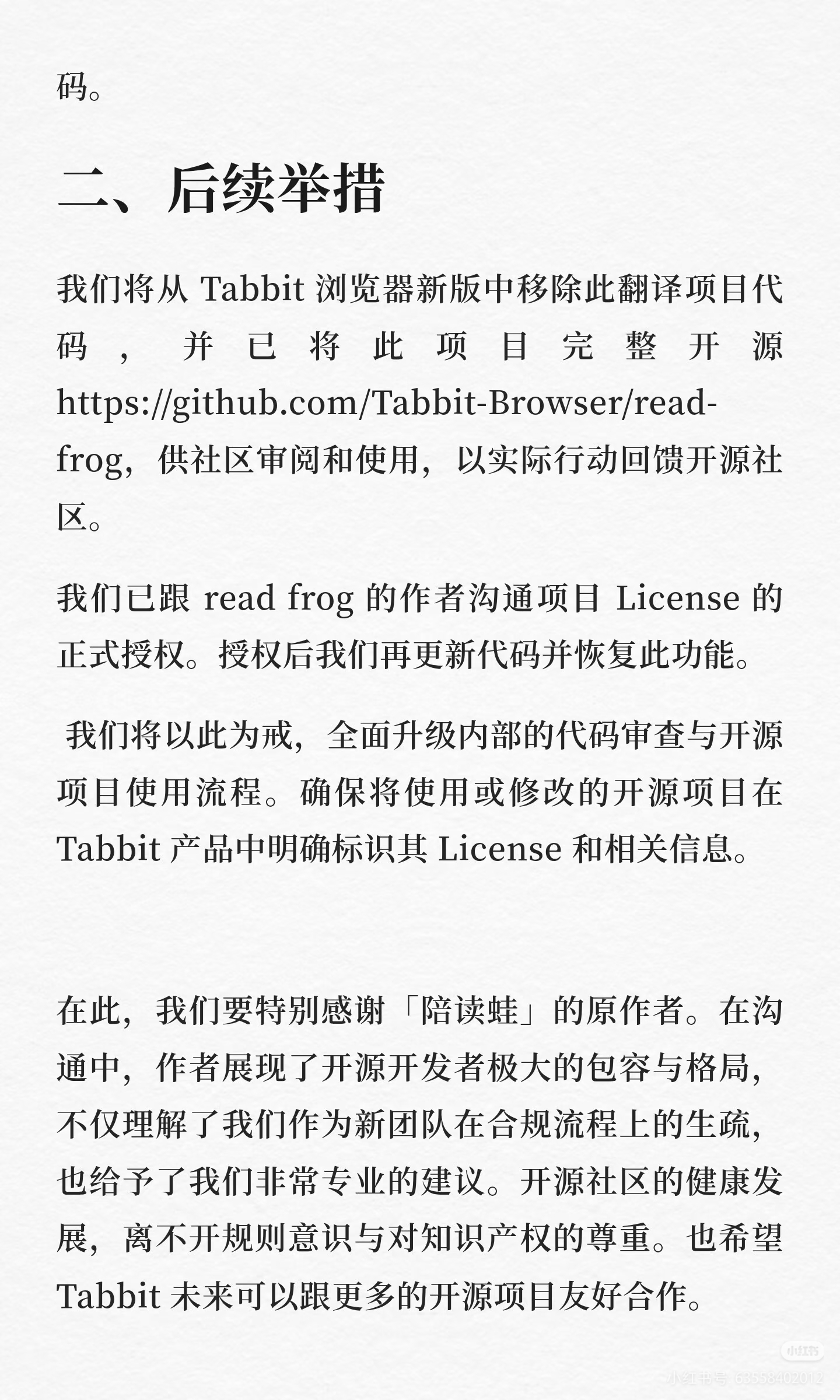 声明提到,Tabbit浏览器已跟read frog的作者沟通项目License的正式授权。授权后再更新代码并恢复此功能。并将以此为戒,全面升级内部的代码审查与开源项目使用流程。确保将使用或修改的开源项目在Tabbit产品中明确标识其License和相关信息。