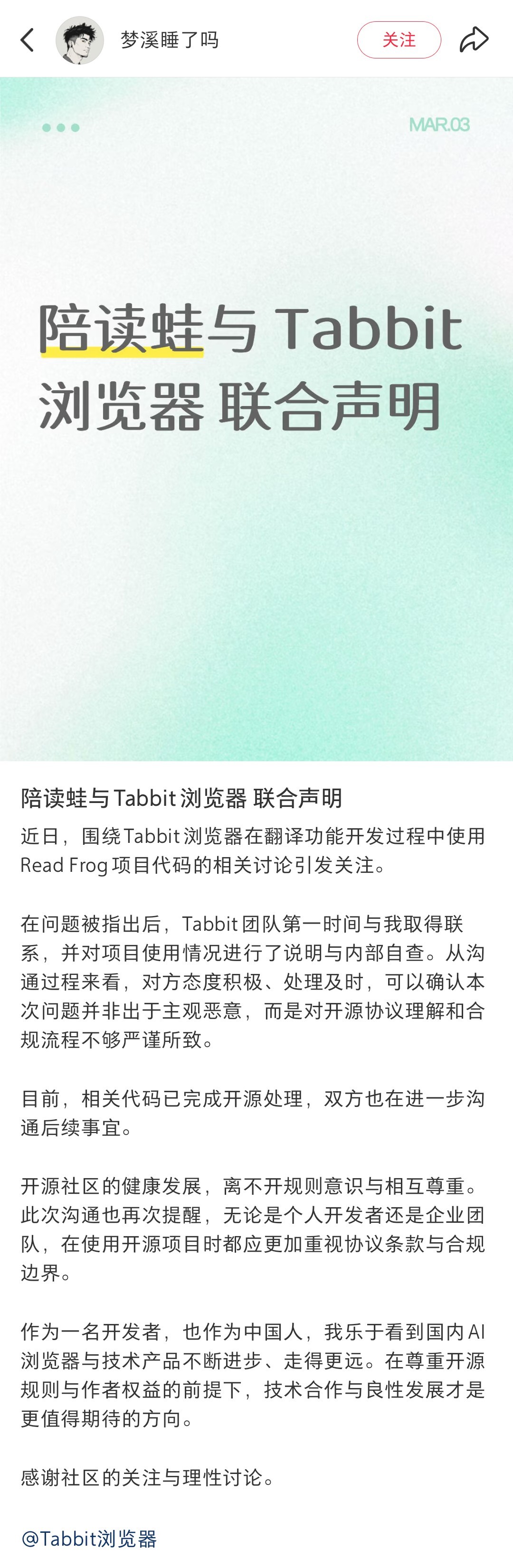 今日下午,Tabbit浏览器与“陪读蛙”开源项目发布联合声明,Tabbit团队表示已经与“陪读蛙”的原作者取得了直接且友好的沟通,并达成了共识。