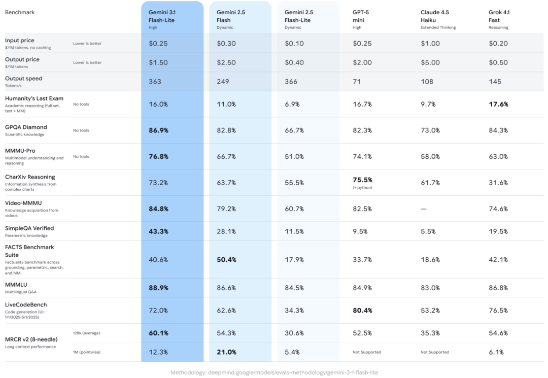 相比于 GPT-5.3 Instant 的好好说话,Gemini 3.1 Flash-Lite 走的是纯粹的务实风,目标非常明确:就是要快,就是要便宜。