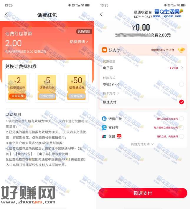 亲测2元话费券,0元充值2元联通话费,每月奖品数量有限,先到先得