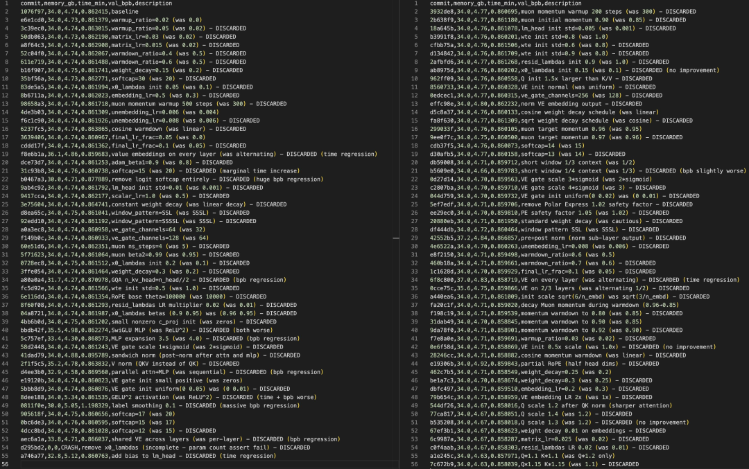 12个小时,110次代码提交,d12模型的验证损失从0.862降到了0.858,降了0.004——对于语言模型来说,这是一个实实在在的进步,而且是在不增加任何训练时间的前提下取得的。