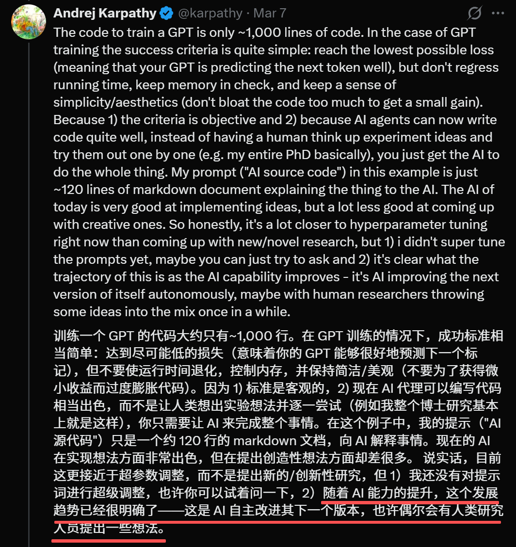 但明天,当模型能力再上一个台阶,当它们不仅能实现想法还能提出想法的时候——那个Karpathy笔下「代码进化为自我修改的二进制生命」的科幻场景,或许并没有我们想象的那么遥远。