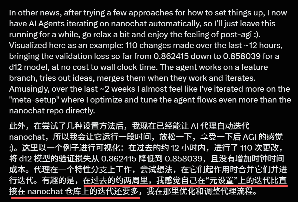 但真正的重头戏来了——Karpathy开始让AI Agent自动迭代nanochat的训练代码。