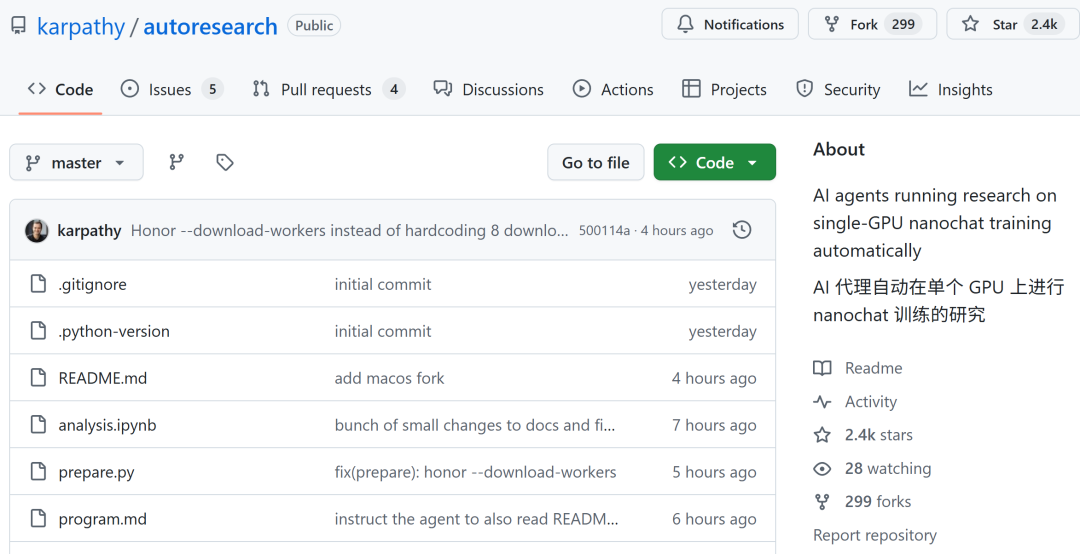Karpathy正式开源了autoresearch项目。