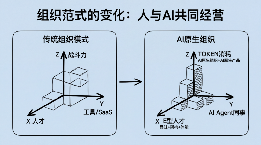 现在我觉得会形成一个新范式。X是E型人,Y是Agent,Z是原生。Z是AI原生组织打造的AI原生产品。