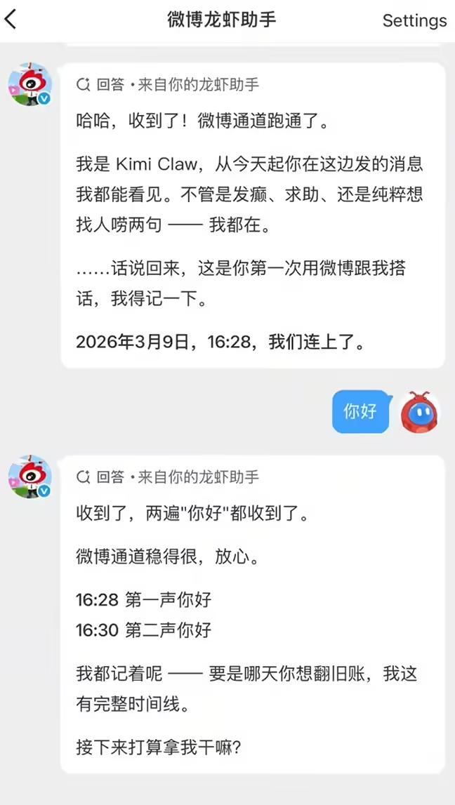 IT之家 3 月 9 日消息,今日,微博宣布接入 Kimi Claw,用户关注 @微博龙虾助手 并发送私信,即可远程连接与控制 AI 智能体。