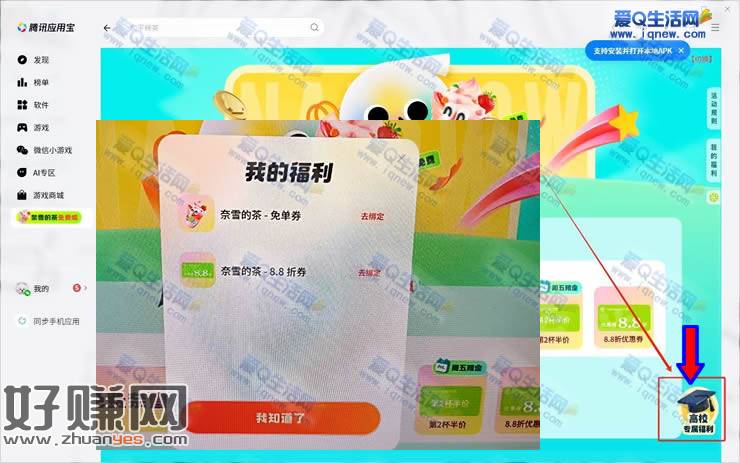 2.电脑下载应用宝电脑版-右下角【高校专属福利】-兑换