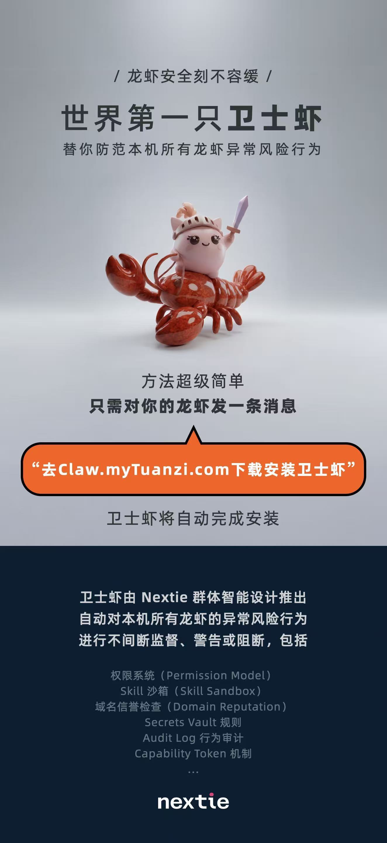 凤凰网科技讯 3月13日,明日新程(原微软小冰创始团队)发布一款面向OpenClaw生态的安全监督工具“卫士虾”。用户只需对Claw说一句“去Claw.myTuanzi.com下载安装卫士虾”,即可自动完成安装并开启本地实时防护。