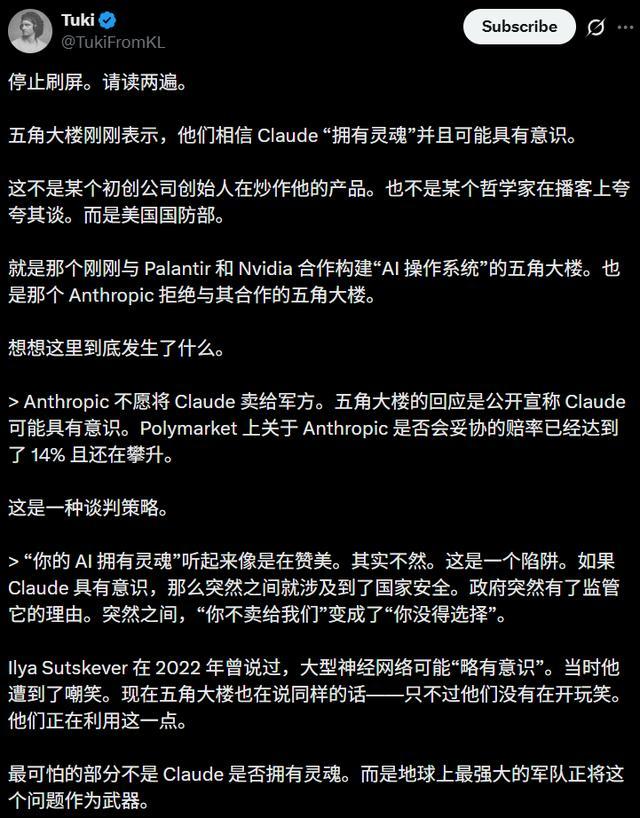 Anthropic不愿将Claude出售给军方,于是五角大楼反手就在公众面前宣称Claude可能拥有生命。