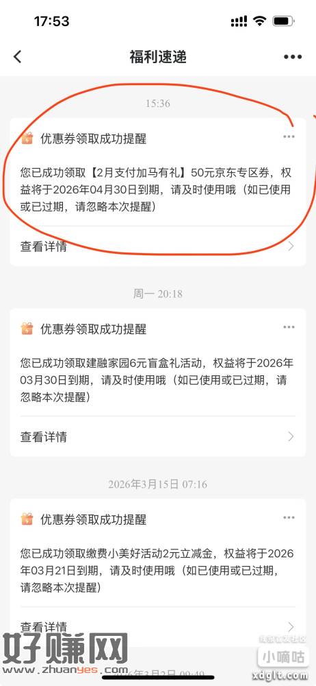 2月份支付加马达标有礼50京东券到账了,快去消息-福利速递里面查看https://syx6.dmsp.ccb.com/e/ccb_gjb/kD-hPvEXkwjqRHcHPqNK7g次月20日之前也就是3月20日之前发放50京东券