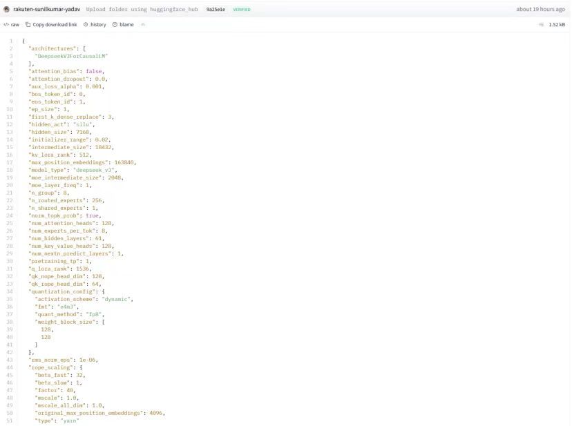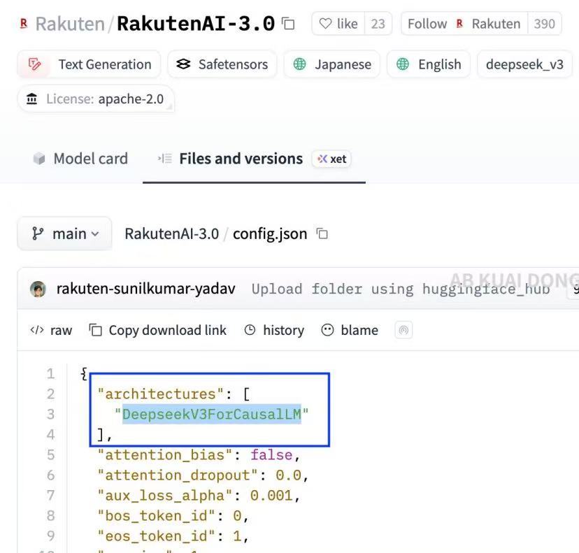 这些回答引发了部分日本网友的质疑,认为该模型可能由中国开发。后来更是有日本网友查看了该模型的配置文件后发现,"日本国内最大规模的高性能AI模型",是DeepSeek V3。