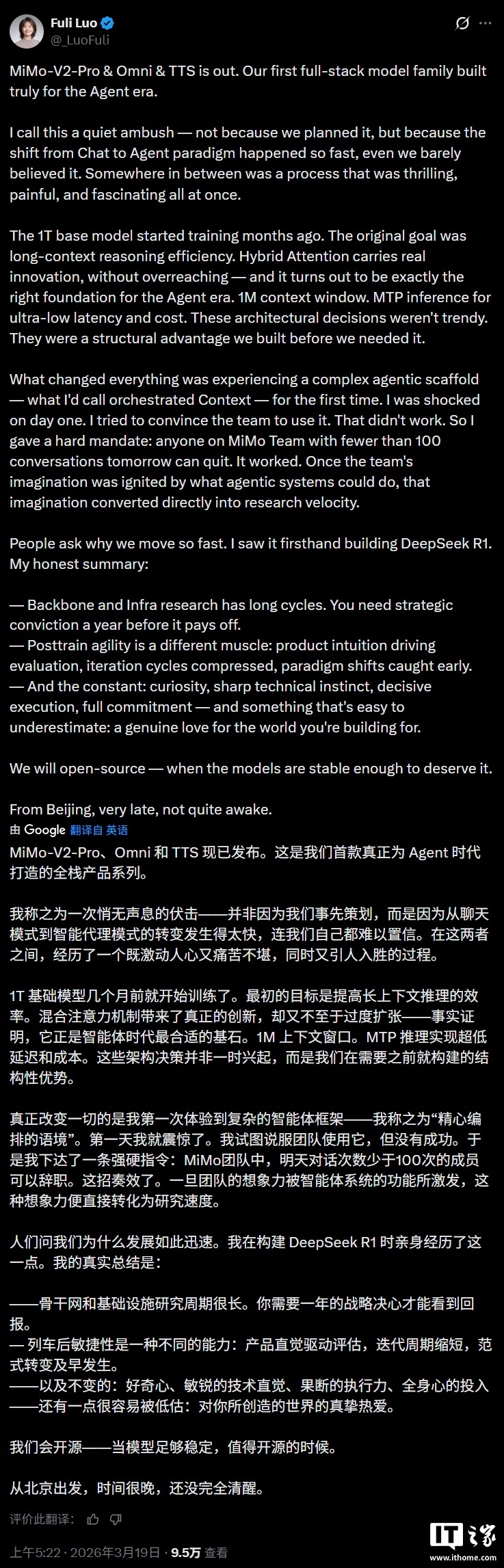 随后,小米 MiMo 大模型负责人罗福莉发布长文,表示这是小米首款真正为智能体时代打造的全栈产品系列。