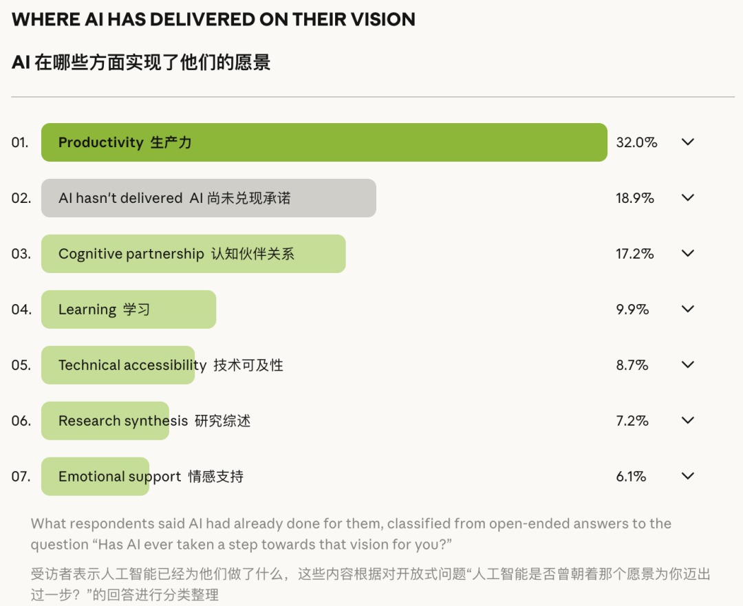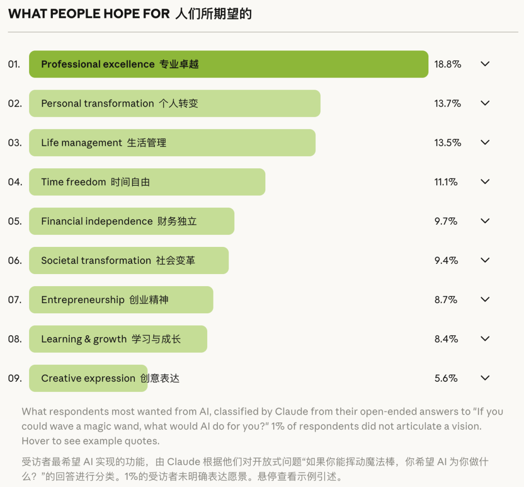 占比最高的是「专业卓越」,约18.8%,也就是希望AI帮自己处理重复性事务,把精力腾出来做更高价值、更有意义的工作。