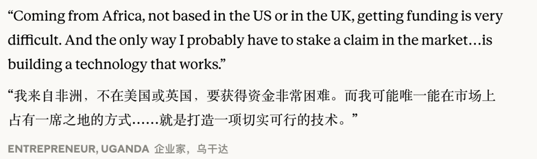 乌干达的一位创业者说:身在非洲融资非常困难,而他几乎唯一能获得市场位置的方式,就是把一项真正能运作的技术做出来。