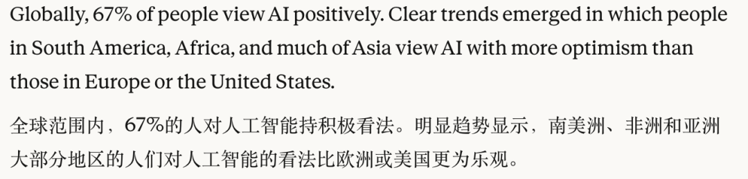 其中一个明显趋势是,南美洲、非洲和亚洲大部分地区的人们对AI的看法比欧洲或美国更为乐观。