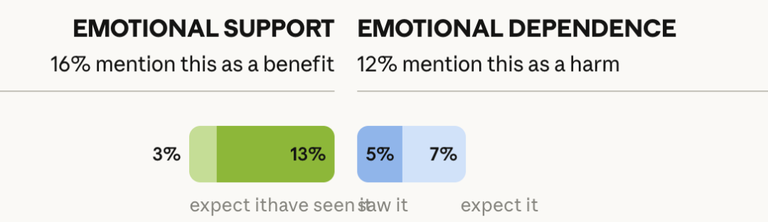 Anthropic发现,16%的人将情感支持视为一项益处,而12%的人认为这是一种危害。