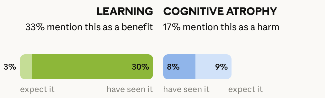 Anthropic的判断是:当学习是主动、自愿、出于内在驱动时,AI更可能成为能力放大器;而在制度化场景中,它更容易变成走捷径的工具。