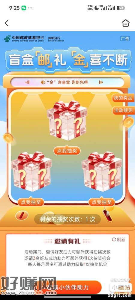 【活动介绍】邮政银行抽立减金【活动时间】1/日次,4次/月,6.30截止【活动规则】直接抽奖【参与方式】邮政银行APP搜索本地生活地区深圳【测试截图】如图
