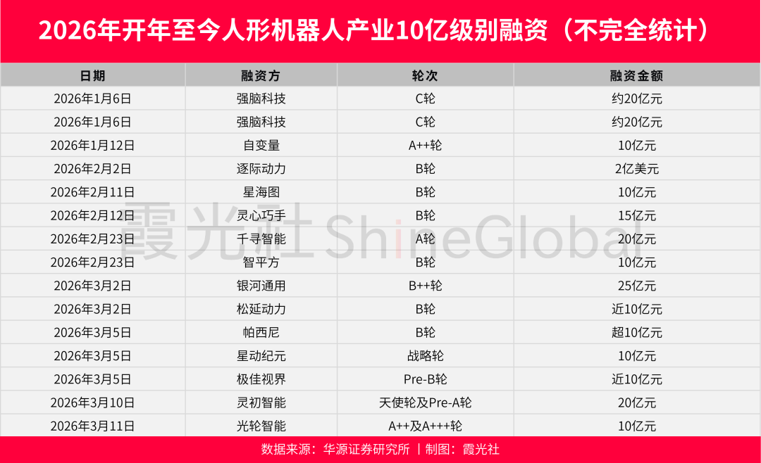 除上市募资外,还有多家企业获得亿元级别融资。开年至今,自变量机、星海图、灵心巧手、智平方、千寻智能、帕西尼、星动纪元等均获得10亿元以上融资,融资后已晋升为百亿估值“独角兽”。
