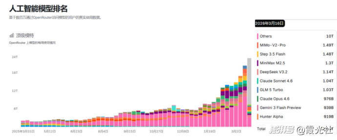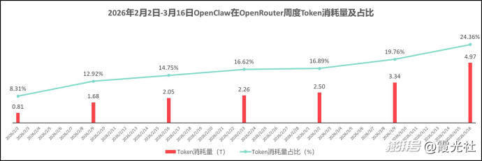 OpenClaw则为本轮Token需求爆发的核心驱动因素。2026年3月16日-3月22日,OpenRouter的周度数据显示,平台接近1/4的Token消耗由OpenClaw贡献。