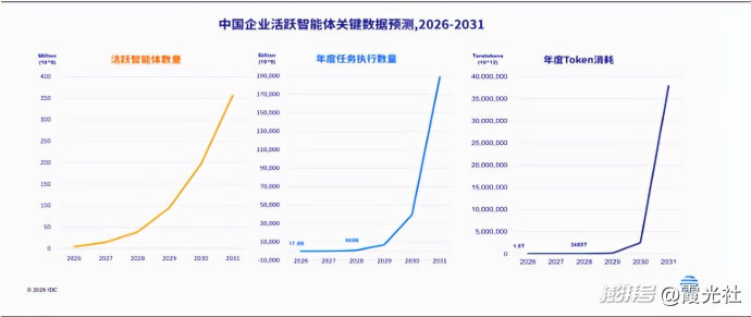 IDC数据显示,中国企业活跃智能体数量预计将在2031年突破3.5亿规模,年复合增长率达到135%以上。同时,由于智能体任务执行密度和任务复杂度的提升,也将带来智能体Token消耗年均超30倍的指数级增长。