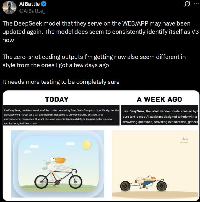 最近X上流传着这么一条消息,说DeepSeek现在说话的方式变了,以前它会叫自己是DeepSeek,现在会叫自己是DeepSeek-V3。因此很多人推测,DeepSeek网页端已经完成了换代,它是DeepSeek-V4,故意微调成V3,掩人耳目。