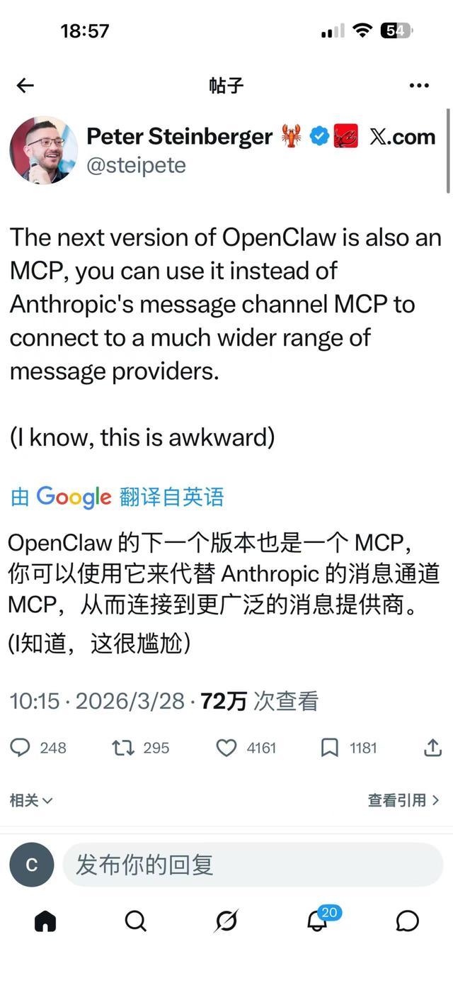 他在3月28号发了一条X,说“下一版的OpenClaw也会是一个MCP”,并且在最后写了一句话说“我知道这很尴尬”。