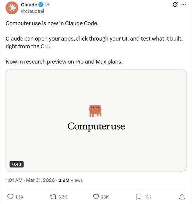 Anthropic官方在3月31号发文,称Computer use功能现已正式加入到Claude Code之中。