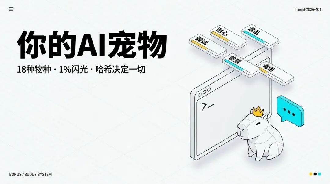 Buddy是一个确定性生成的虚拟宠物,住在你的Claude Code终端里,有ASCII精灵图,偶尔冒出语音气泡评论一下。