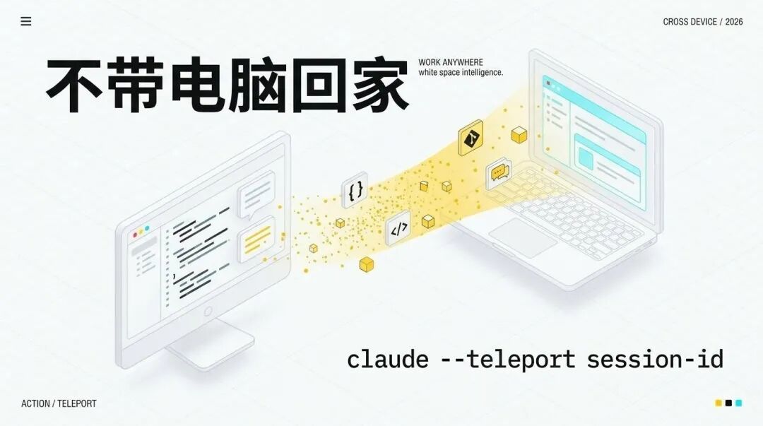 公司电脑干到一半,回家claude --teleport继续。所有上下文跟着你走。