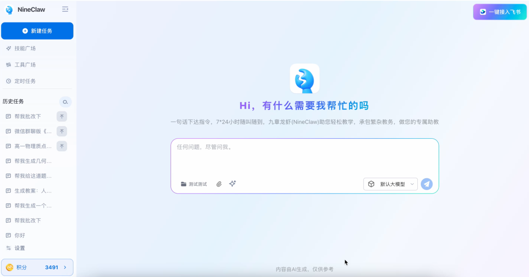 在深度体验后,我们也看到了九章龙虾的诸多核心能力,上手简单,可一键部署,通过skills包的预埋,提前带入了作业批改、课件制作等多种技能。