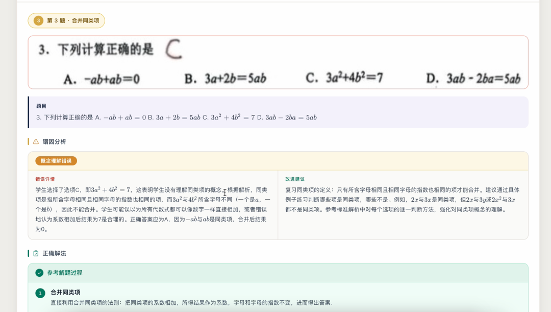 如将一份试卷拍照上传,智能体可自动完成学情诊断、批改与知识点分析,并生成一份网页版诊断报告。