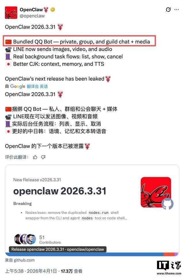 据IT之家今日早些时候报道,AI 智能体与自动化框架 OpenClaw 日前正式发布了 v2026.3.31 版本。根据更新日志显示,此版本的主要变动是原生捆绑了 QQ 机器人(QQ Bot)作为内置渠道插件。