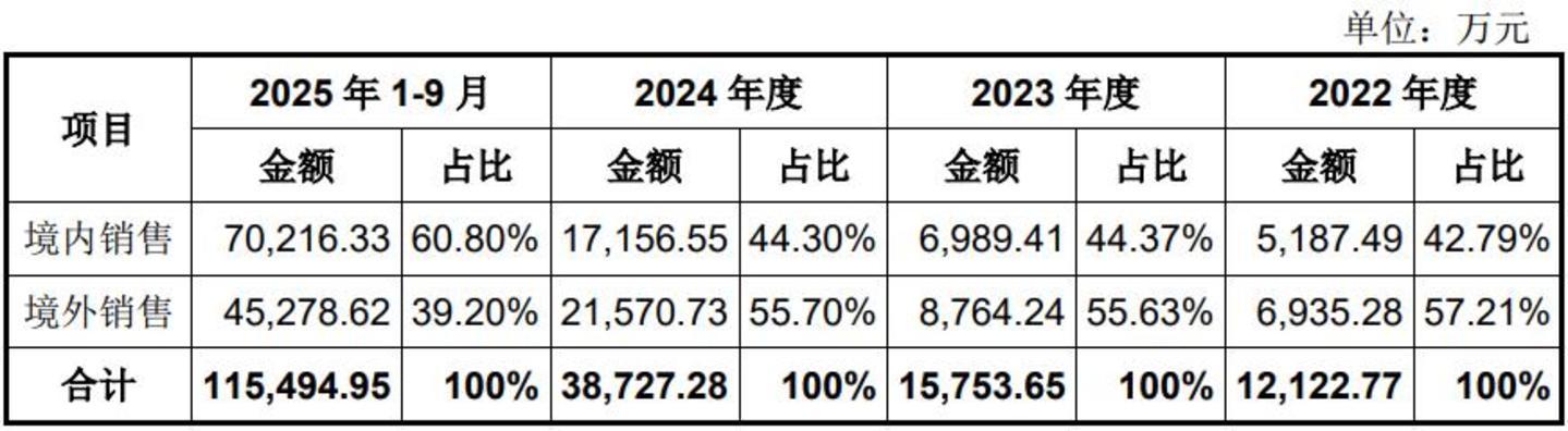 招股书也显示,其2022年-2024年境外收入占比连续三年超过55%,即境内收入占比低于45%;2025年境内收入占比60.80%、境外收入占比39.20%。