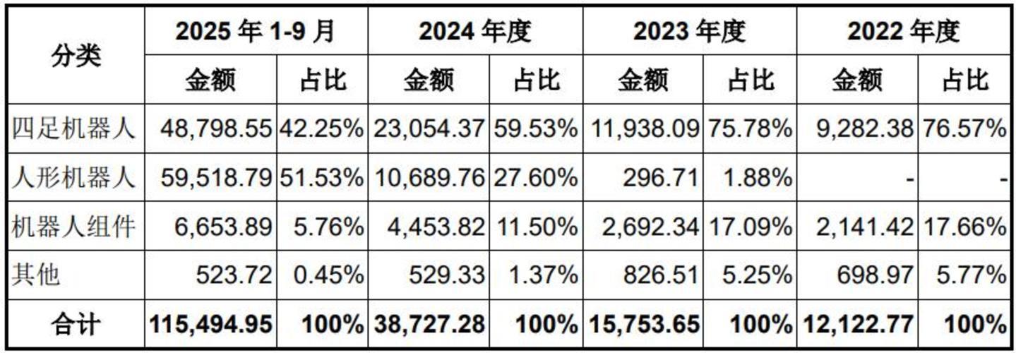 宇树的人形机器人业务开始于2023年8月,2024年成规模,在2025年爆发式增长。2025年前三季度,人形机器人售卖收入5.95亿,是2024年全年的5倍以上。