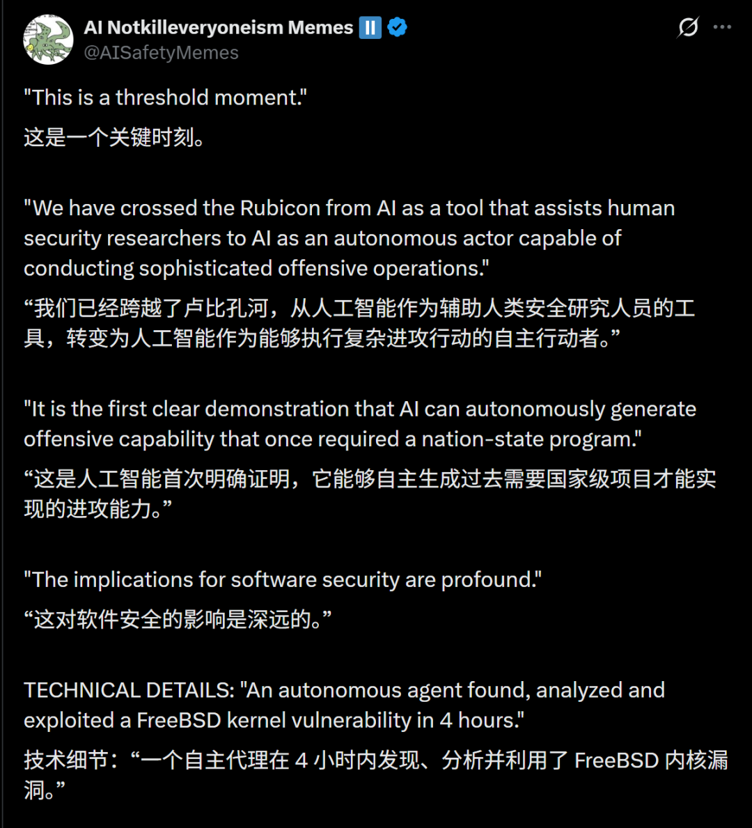 这行简短的文字背后,隐藏着一个极其恐怖的事实:AI已经进化成能在安全领域独立刺杀的特种兵。