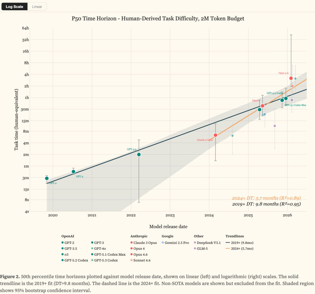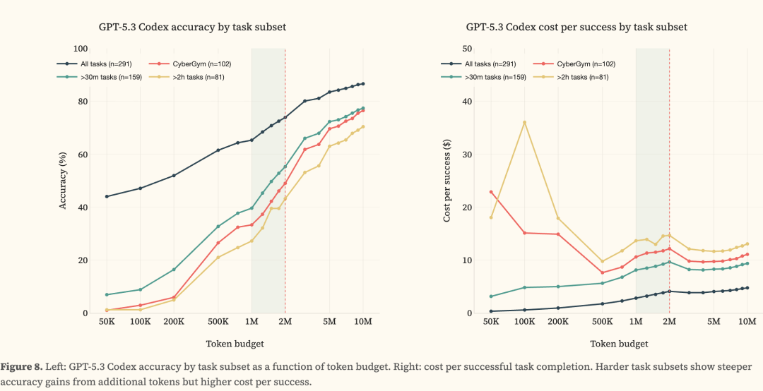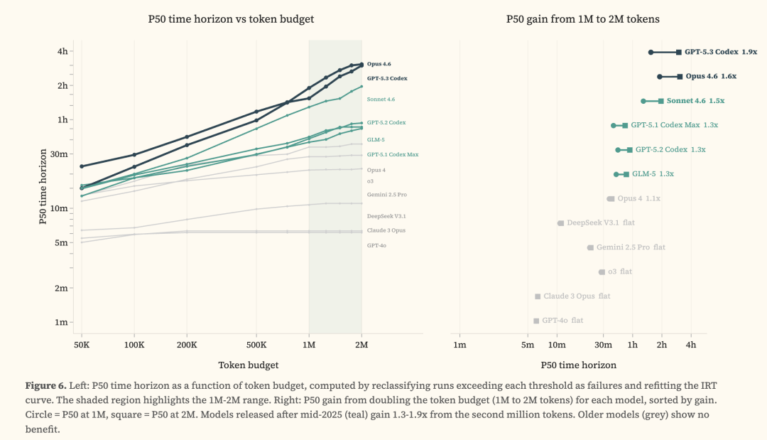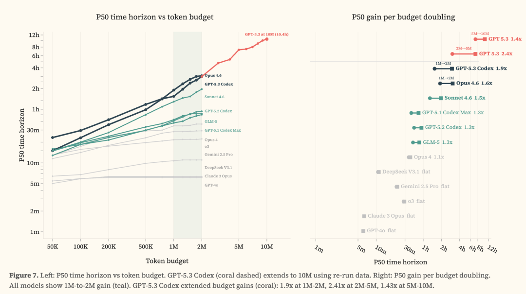 GPT-5.3 Codex和Opus 4.6,在2M token预算下就50%成功率干掉人类专家3小时任务。