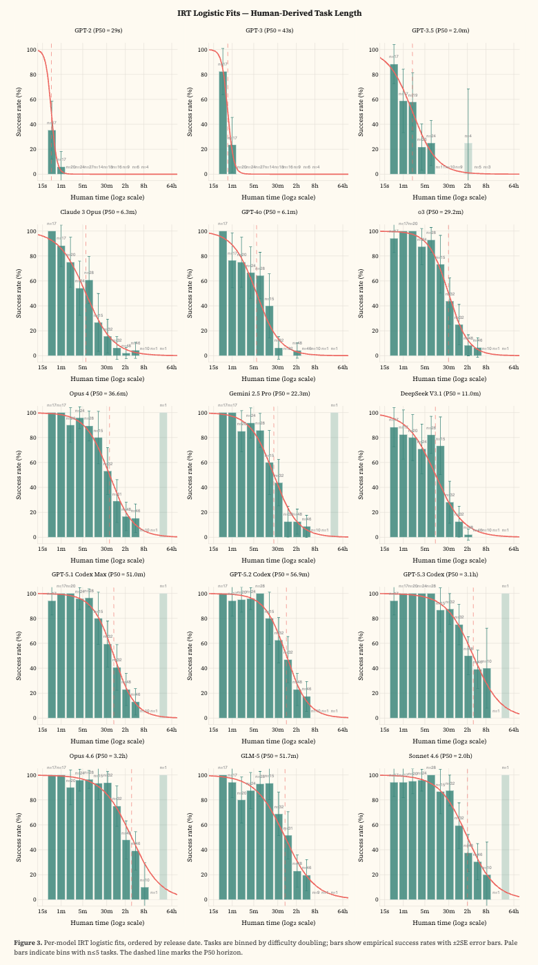 Lyptus把每个任务先标上「一个熟练人类专家通常要花多久完成」,再看模型在不同难度上的成功率;