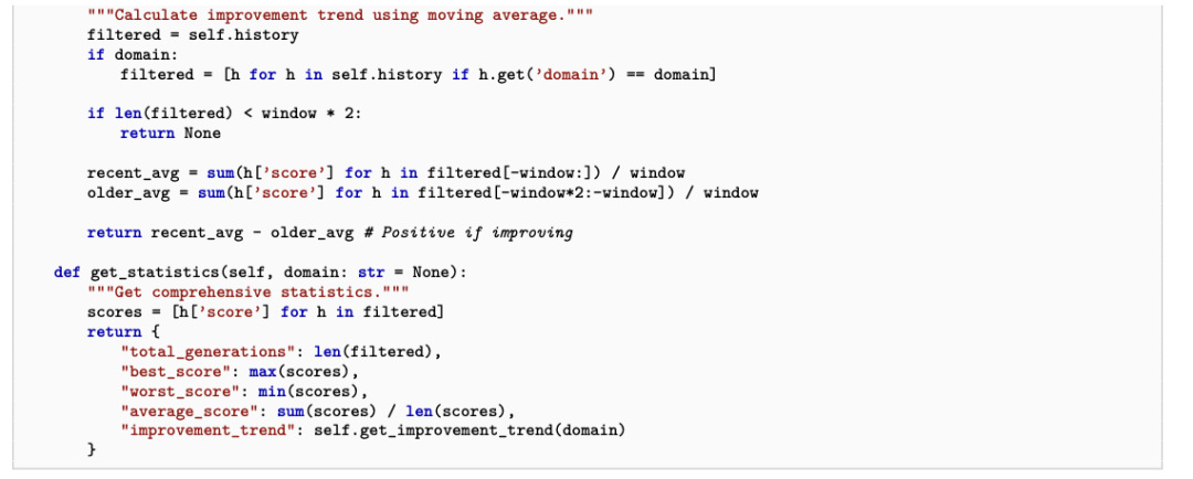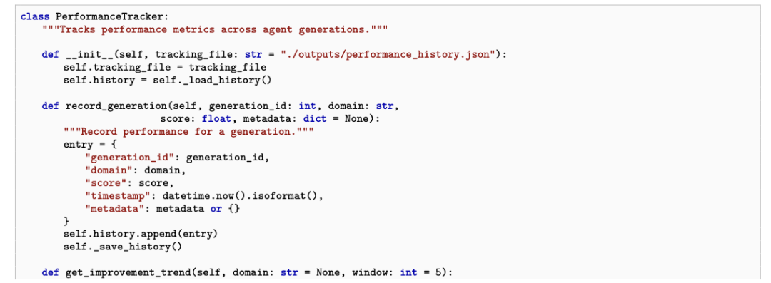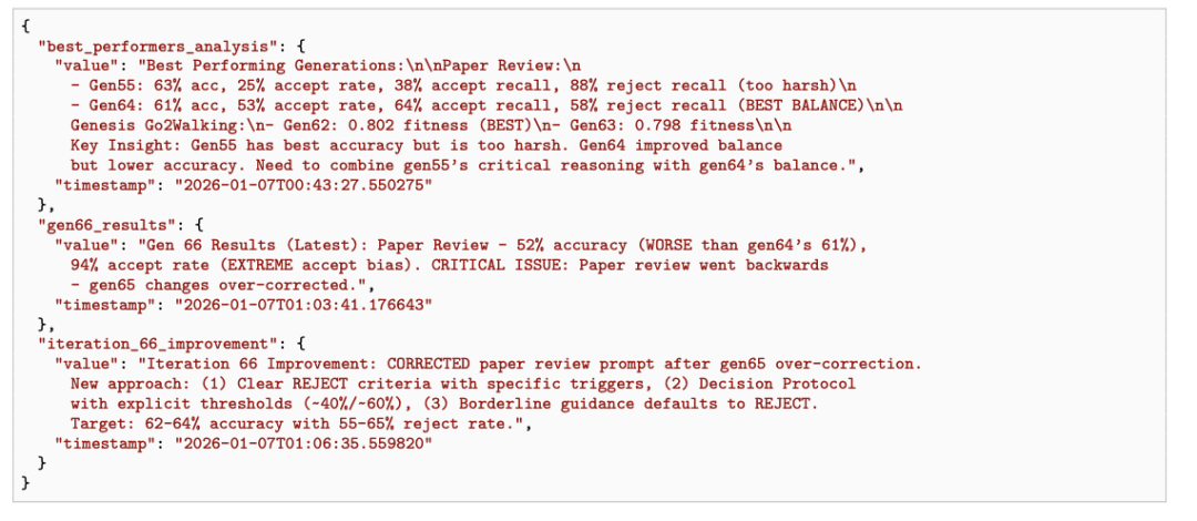 论文中甚至直接给出了自动生成的性能追踪器代码和持久记忆条目:它开始记录跨代指标、总结哪些代际策略有效、诊断过度修正、制定下一轮改进计划。