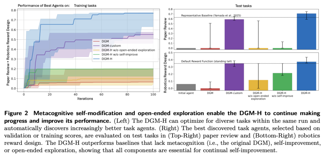 在paper review上,初始agent在测试集得分为0.0,DGM-H提升到0.710;在robotics reward design上,则从0.060提升到0.372。