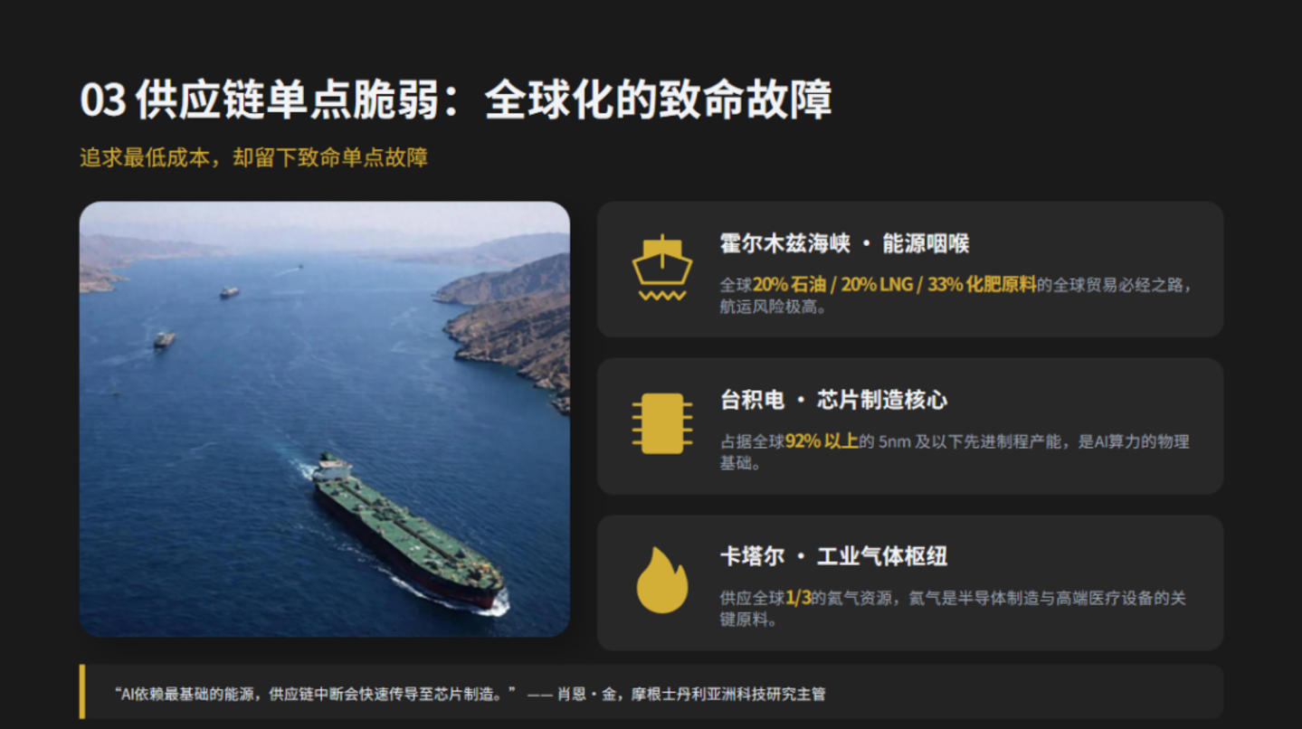 全球化追求最低成本,却留下致命单点故障:全球 20% 石油、20% LNG、33% 化肥原料经霍尔木兹;台积电占据全球 92% 以上 5nm 及以下先进制程产能(2024 年底数据显示,其 5nm 制程占自身晶圆销售额 34%、3nm 占 26%);1/3 氦气来自卡塔尔。
