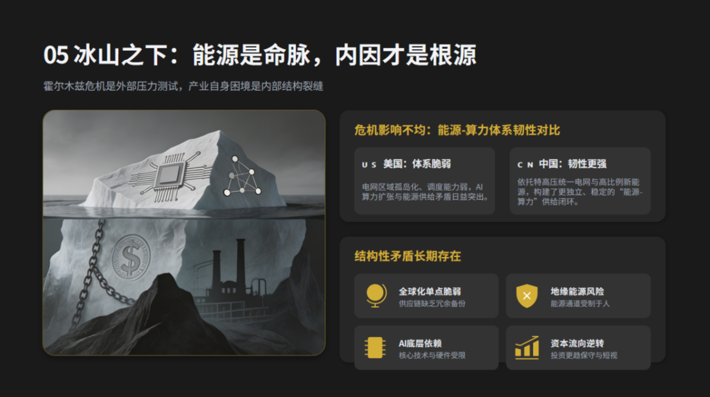 危机影响并不均等:美国电网区域孤岛化、调度能力弱,AI 算力与能源矛盾突出;中国依托特高压统一电网、高比例可再生能源,形成更独立的 “能源 - 算力” 供给体系,韧性更强。这意味着,在全球 AI 算力因能源成本飙升而被迫降速时,中国算力中心可能获得相对的成本优势和供应稳定性。