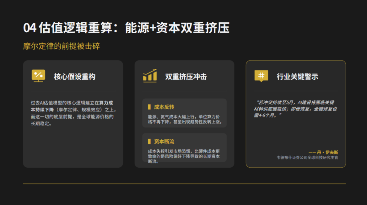 过去 AI 估值模型的核心假设是算力成本持续下降(摩尔定律、规模效应),前提是能源价格稳定。而霍尔木兹危机,直接击碎这一前提:能源、氦气成本上行,单位算力价格不再下降,甚至反转上涨。