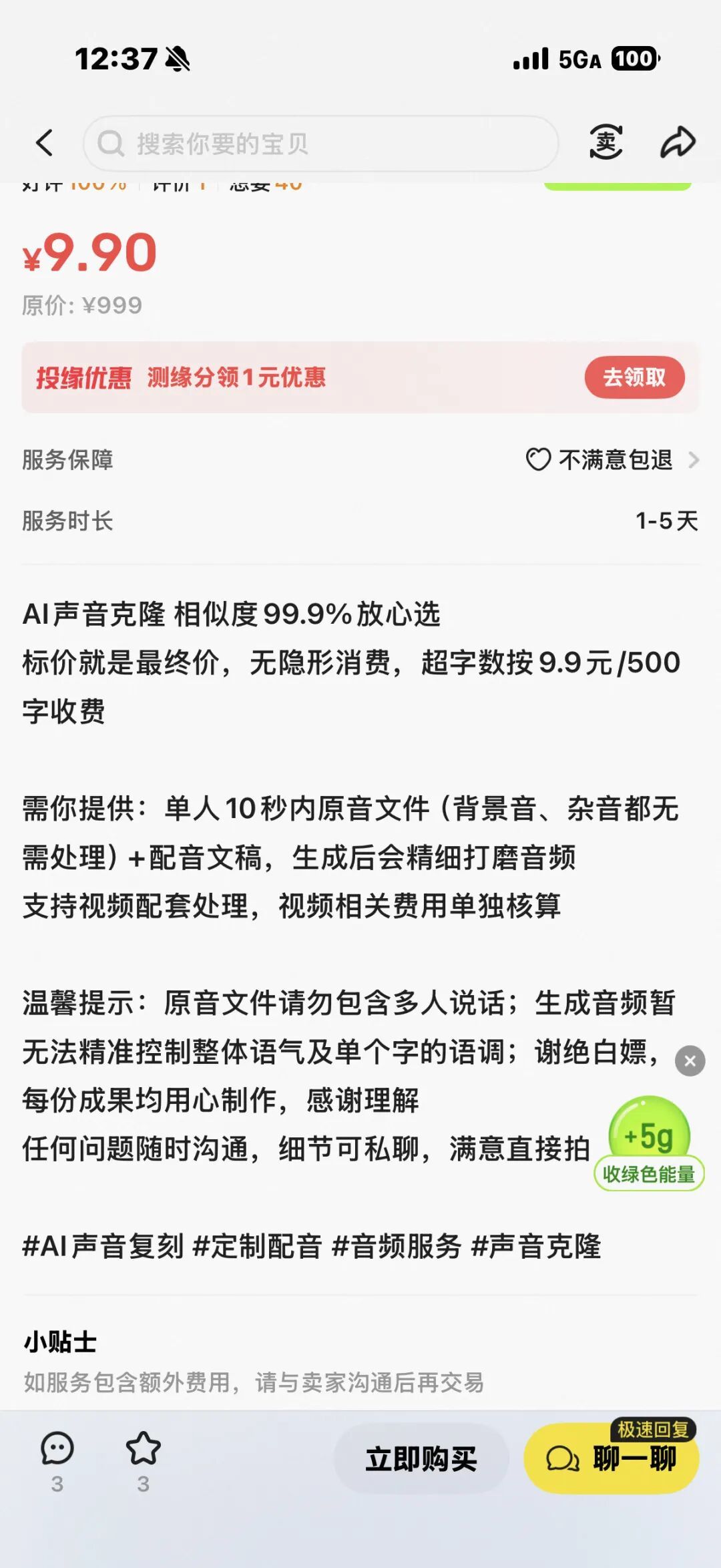 此前据蓝鲸新闻报道,记者在二手交易平台查询发现,“AI声音克隆服务”价格极为低廉,1500字左右的声音克隆服务甚至不到10元。实现这一切只需要1分钟左右的单一人物声音文件即可。