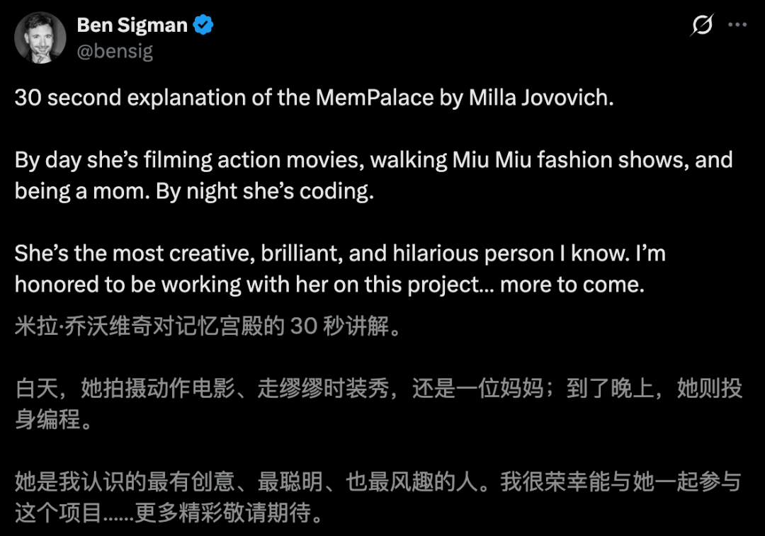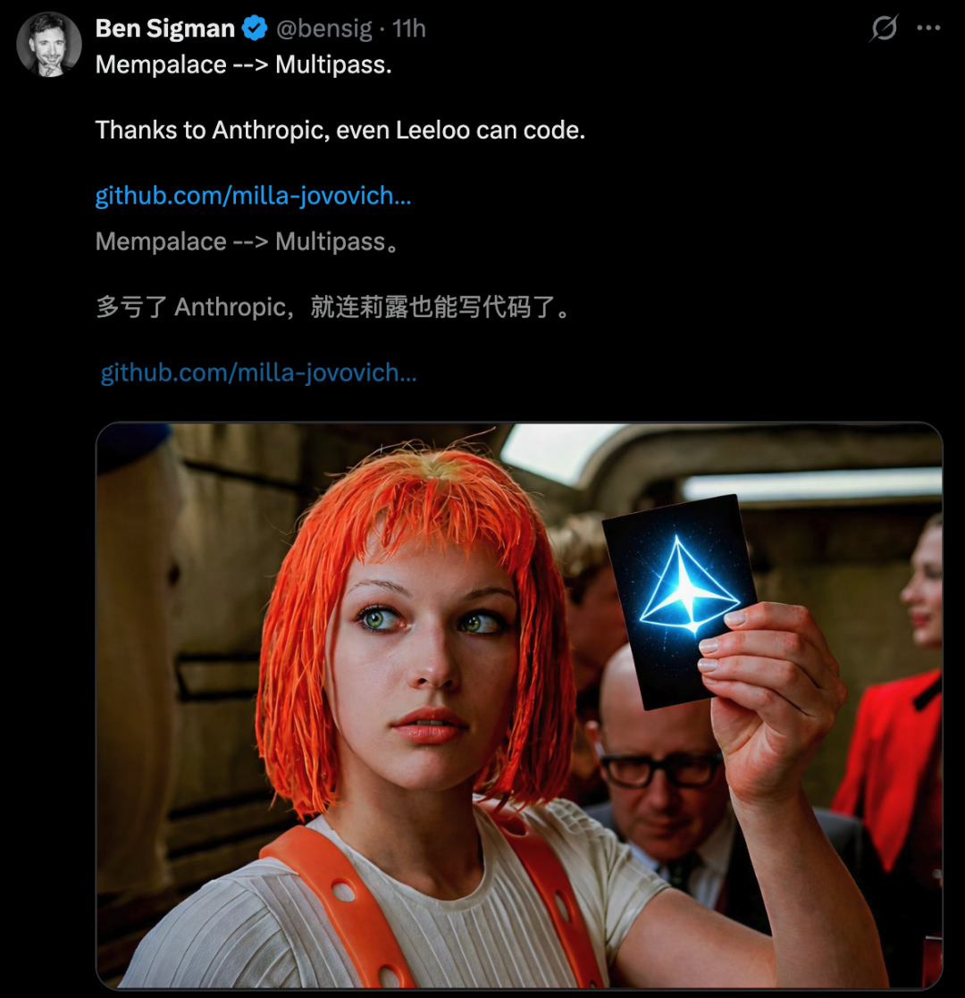 Ben最新一条帖子中,还做了一个双关:Mempalace -> Multipass。