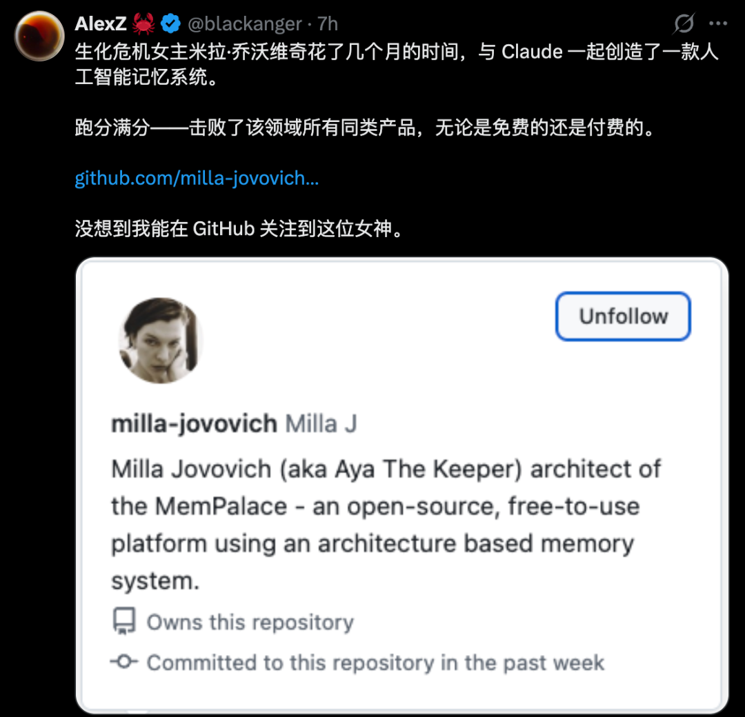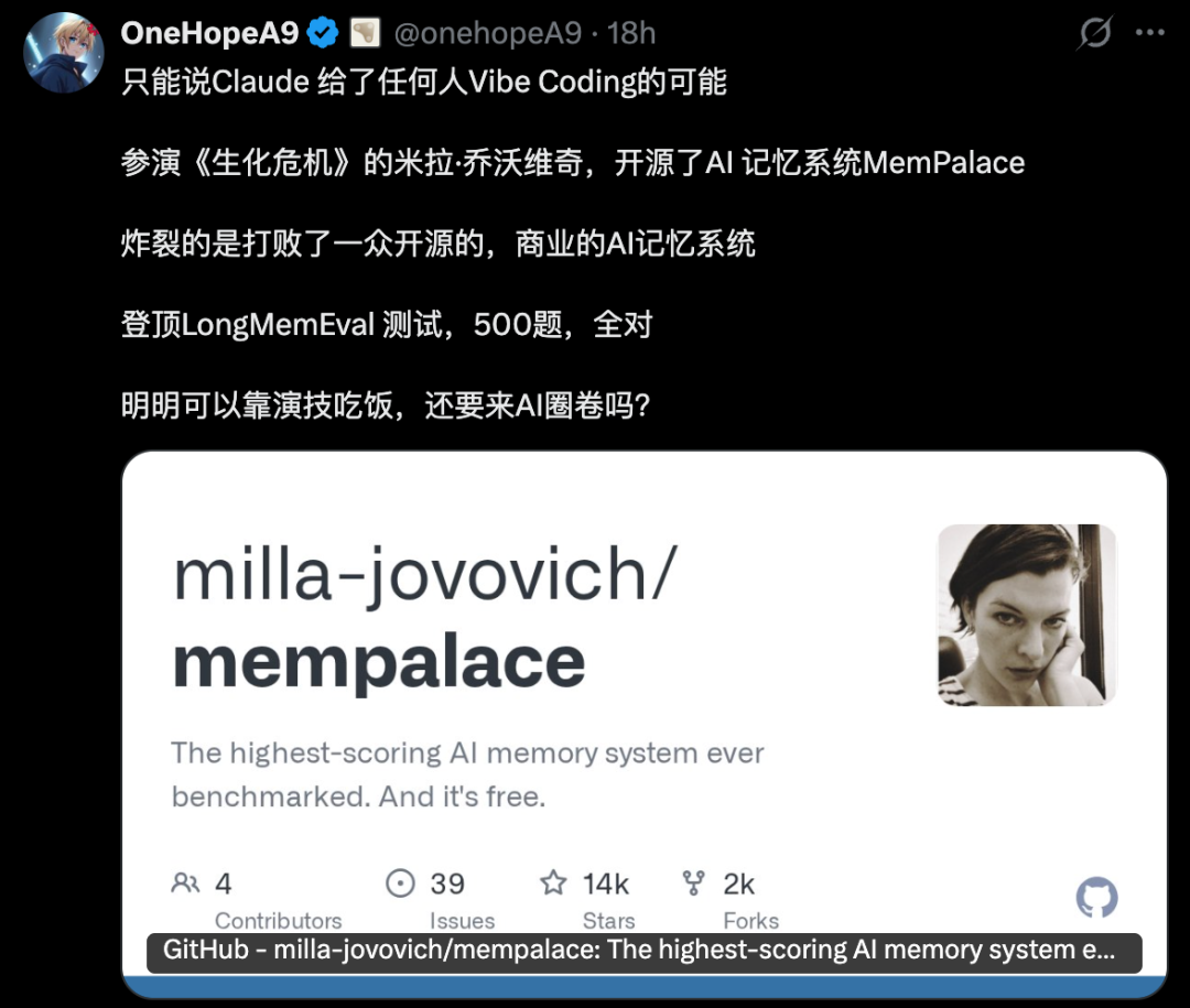 两人联手打磨了6个月,最终这套名为「记忆宫殿」的系统——MemPalace,正式破壳而出。