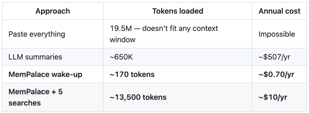 若要用MemPalace,每次AI启动只加载170个token的关键事实——你的团队、项目、偏好....只在需要的时候才检索。