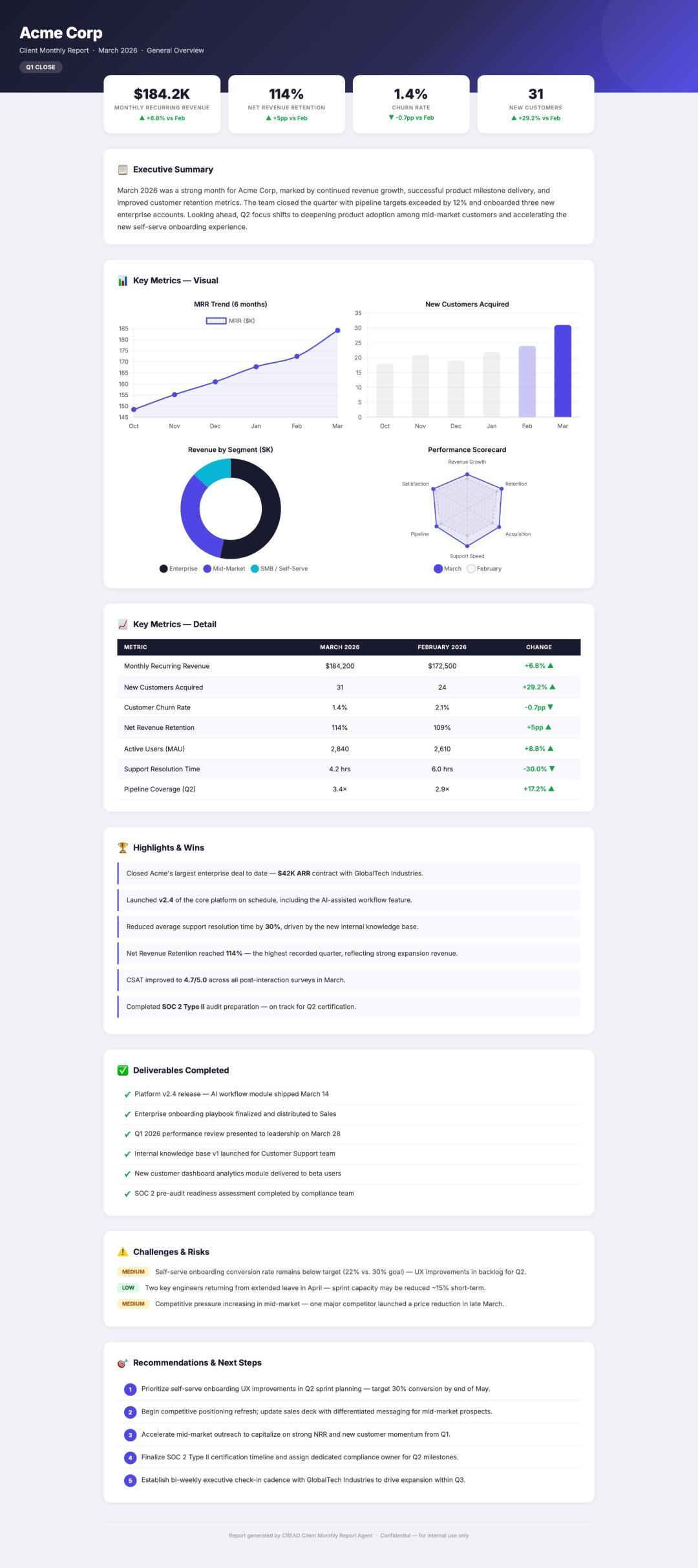 比如,你输入提示词:「为 Acme Corp 生成一份 2026 年 3 月的专业月度报告。包括关键指标、图表、亮点、风险和建议,并以 PDF 格式输出」,之后系统会自动生成整套执行逻辑,并完成了一份完整报告。