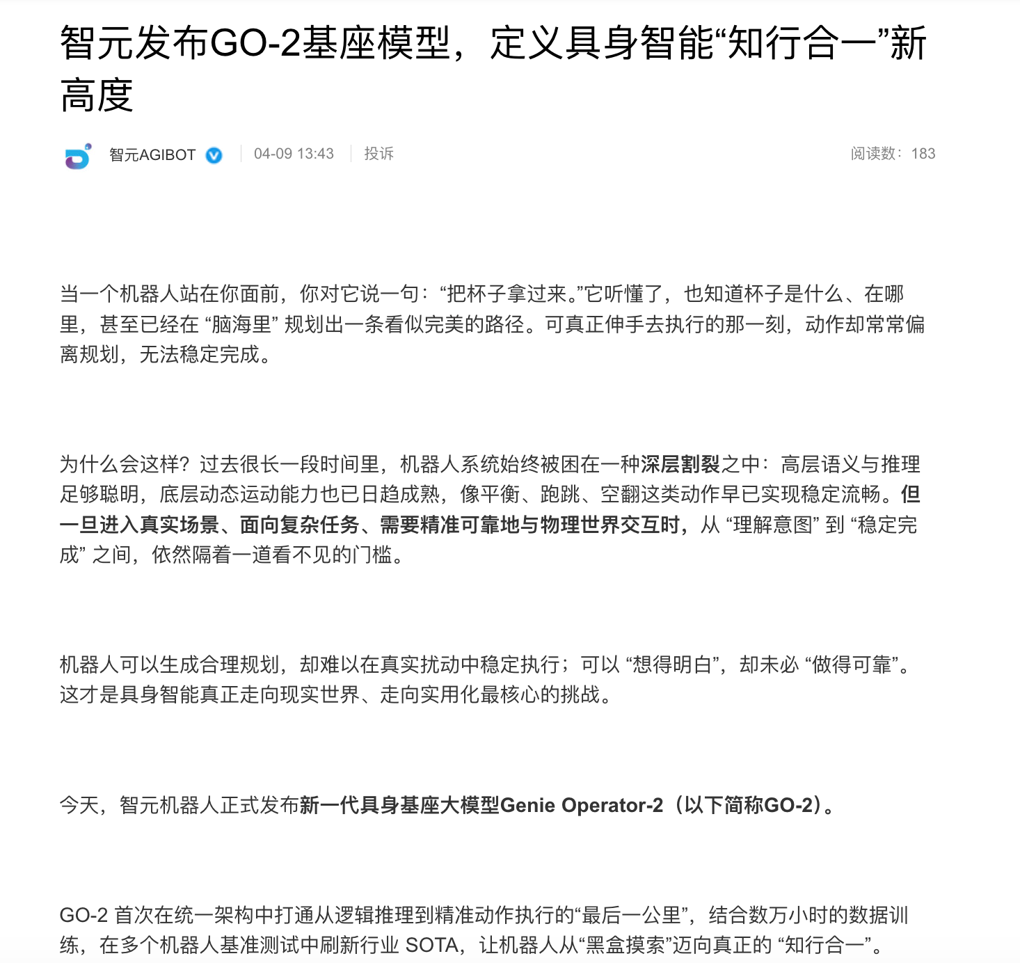 凤凰网科技讯 4月9日,智元机器人宣布正式发布新一代具身基座大模型Genie Operator-2(简称GO-2)。该模型旨在解决机器人从“理解意图”到“稳定执行”之间的断层,在统一架构中打通逻辑推理与精准动作执行的链路。