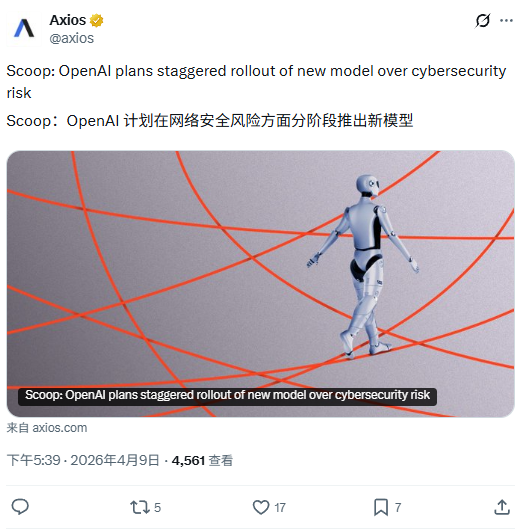 IT之家 4 月 9 日消息,知情人士向 Axios 透露,OpenAI 正在完善一款具备高级网络安全能力的模型,但计划仅向一小部分公司开放,这一做法与 Anthropic 此前对 Mythos 模型采取的限制性发布类似。